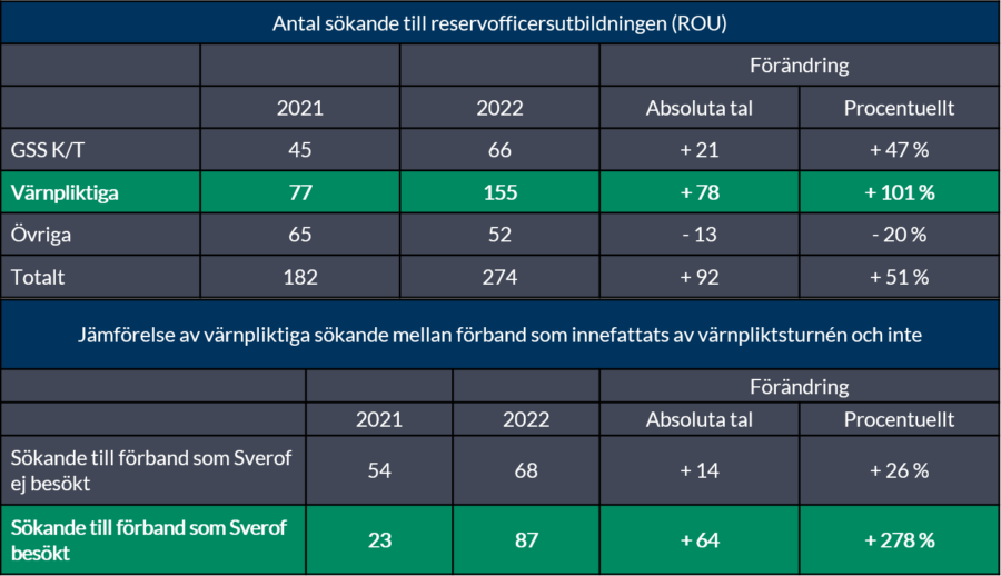 – Försvarsmakten har sett både ett ökat antal sökande totalt och en större andel sökande direkt från värnplikt. Att rekrytera blivande reservofficerare ur värnpliktskullen är avgörande för Försvarsmakten för att nå målen. Därför är denna ökning särskilt glädjande. Ökningen sammanfaller med Sverofs projekt med att bland annat besöka värnpliktiga på förbanden och informera om reservofficersyrket. Vi bedömer att Sverofs insats gett bra utfall, säger överste Peter Nilsson, sektionschef, Ledningsstabens personalavdelning, rekryteringssektionen.