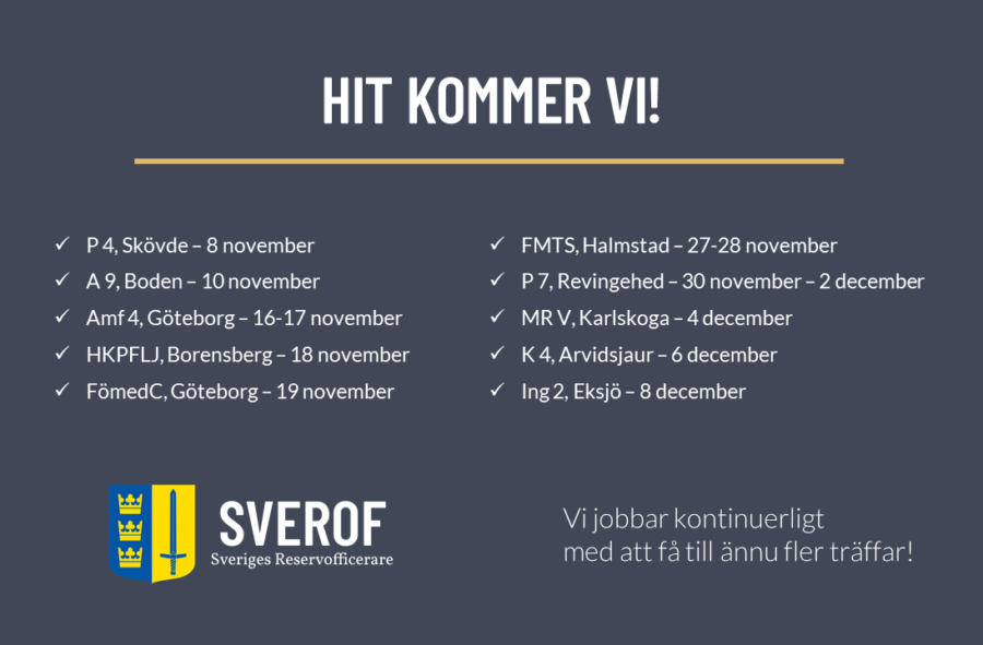 I början av november inleds en intensiv period med träffar och marknadsföring inför att sökfönstret till Försvarsmaktens reservofficersutbildningar öppnar den 29 november. Totalt kommer Anton Kindlund, projektledare för Sverof 2.0, att möta ungefär 2000 värnpliktiga och ge kvalitativ information om reservofficersyrket, hur livet som RO-kadett är och hur en reservofficersutbildning kan gynna den enskilde i den civila karriären.